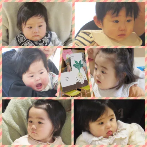 次に絵本の読み聞かせの時間は、「やさいさん🥕」「たまごをこんこんこん🥚」「くだものいろいろかくれんぼ🍌🍎🍊」の大型絵本の読み聞かせをしました。